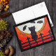 Imagem é minha pintura original. Este gato preto está sentado sobre uma cerca de saliva preta observando morcegos voarem sobre uma lua grande. O fundo é laranja com uma fronteira negra e o texto diz Feliz Halloween. Veja minha loja Art by MAR para combinar produtos com este design.