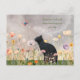 Um gato preto tranquilo se senta num pedaço de flores bonito e observa uma borboleta colorida voando pelo ar. As palavras "Às vezes, são as pequenas coisas que trazem alegria para o nosso dia" podem ser removidas ou alteradas se desejarem.