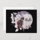 Um cartão postal de saudação com uma pintura aquosa de um gato preto e um buquê floral roxo e rosa claro. Em frente a uma grande lua de cheio. Na moda e mágico.