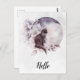 Um cartão postal de saudação com uma pintura aquosa de um gato preto e um buquê floral roxo e rosa claro. Em frente a uma grande lua de cheio. Na moda e mágico.
