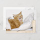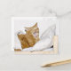 Gato de mesa laranja acordando com um boi grande em um cartão postal de foto de cama real
