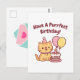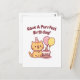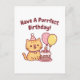 Um gato malhado laranja fofo tem balões e um bolo de chocolate coberto com glacê e morangos. O cumprimento de aniversário com trocadilho engraçado diz "Tenha Um Aniversário Perfeito!" ♥
