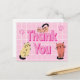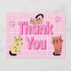 Diga Obrigado com este cartão postal adorável. Um fundo rosa estilo retrô legal com um padrão de grade branca por cima. No centro estão as palavras Obrigado em letras rosa com uma sombra de queda rosa quente para fazê-lo se destacar. À esquerda, à direita e no topo das palavras estão gatos doodle fofos. e impressões de patas rosa no fundo para completar o visual.