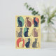 Cartão postal em nove gatos estilizados dispostos em um padrão de grade, cada um se posiciona contra diferentes colores de fundo. Os gatos apresentam cores casaco e padrões variáveis, dando a cada um uma uma aparência única.