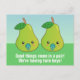 Um desenho bonito de um par de peras verdes com pacificadores azuis e uma licença nos seus caules. A legenda diz: "Boas coisas vêm em um par! Estamos tendo gêmeos!" Um design adorável, frutado e humorístico que é excelente como seu anúncio para seus gêmeos igualmente bonitos. Design por Rusty Doodle.