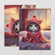 Eine kleine Katze sitzt im Bett und trinkt Tee und wünscht sich bald wieder mit dir schmusen zu dürfen.