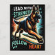 Uma ilustração digital vibrante de um German shepherd correndo para a frente, com uma coleira atrás dele. O fundo é uma espiral colorida de azul, amarelo e vermelho, com uma citação lendo Chumbo com Força, Siga com Coração.