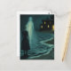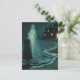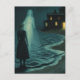 A ghost and a woman on the beach with a house with all the lights on in the background