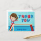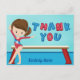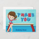 Este cartão de agradecimento de festa de aniversário de ginástica feminina apresenta uma bonita ginasta morena em frente a uma trave. Ela está usando um maiô vermelho e sorrindo ao lado de seu belo monograma azul.