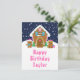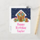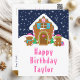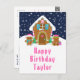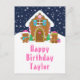Este cartão postal de aniversário fofo e festivo pode ser personalizado com um nome ou título como filha, neta, sobrinha, amiga, etc. A design apresenta uma bela casa de pão de gengibre decorada com doce de Natal rosa e verde. Além disso, são adoráveis gengibres com presentes, vestidos com chapéus de Papai Noel e cachecol. Ao fundo está um céu azul marinho de inverno com flocos de neve em queda elegante. O texto é corajoso e festivo. Isto é perfeito para o Natal e o feriado de inverno.