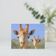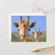 Cartão-postal com um fecho de duas girafas doces e gentis enquanto caminham contra um céu azul ensolarado com colinas verdes no fundo. Foto tirada em San Diego, Califórnia.
