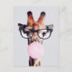 Girafa vestindo óculos soprando uma pastilha elástica rosa.