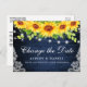 Cartão postal de adiamento de casamento moderno e elegante com girassol em aquarela e folhagens em madeira azul rústica com luzes de corda e renda.