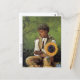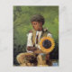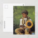 Um cartão-postal de arte com a pintura Levando Sunflower a Professora (1875), de Winslow Homer (1836-1910), artista norte-americano do movimento realismo. Um jovem estudante afro-americano sentado segurando um grande girassol.