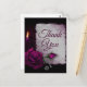 Cartão postal de agradecimento de festa com visual gótico. Um papel pergaminho cinza envelhecido com tons de roxo-avermelhado. Uma rosa magenta em plena floração, um botão de rosa, uma vela e um medalhão de prata sobre um fundo burgundy escuro criam um cartão gótico lindo e misterioso.