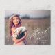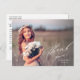 Este elegante obrigado de graduação que você faz com cartão-postal apresenta uma foto de cheio e uma caligrafia elegante. "Obrigado" está escrito em bonito escrita branca no canto inferior direito, com o nome do formando e o ano de graduação abaixo. Esse design de tipografia branca sobrepõe uma foto de cheio do novo formando (orientação horizontal/paisagem). No verso, você pode gravar uma mensagem personalizada para os destinatários ou excluir o texto do modelo para criar uma área de vazio para uma nota manuscrita.