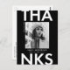 Obrigado moderno de graduação, você pode fazer o cartão com a foto do formando com "Obrigados" em letras brancas e fundo preto. Personalize a frente do obrigado de graduação de fotos que você faz no postal, adicionando o nome do formando, o nome da escola e o ano de graduação. A parte traseira do cartões de agradecimentos de fotos de graduação apresenta seu endereço de retorno com espaço para sua mensagem digitada ou manuscrita.