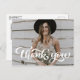 Graduação de Foto com Script Retro Branco em Branco Obrigado Cartão-Postal | Envie obrigados com este obrigado paisagístico personalizável que você postais. Apresenta a escrita retrô e a tipografia simples. Isso será perfeito para casamentos, graduações e muito mais.
