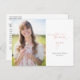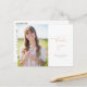 Este obrigado de graduação minimalista que você faz no postal apresenta uma grande foto e uma caligrafia casual escrita à mão. "Obrigado" está escrito em um roteiro de ouro rosa moderno, com o nome do formando e o ano de graduação abaixo em cinzas, tudo contra um fundo branco nítido. À esquerda, adicione uma grande foto do novo formando. No verso, você pode gravar uma mensagem personalizada para os destinatários ou excluir o texto do modelo para criar uma área de vazio para uma nota manuscrita.