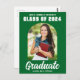 Este cartão-postal do formando de fotos personalizado, verde e branco, moderno, apresenta seu segundo grau ou nome de faculdade para a classe de 2024. Personalize com o seu nome sob o chic, o guião manuscrito em negrito e o trendy arch para um cartão postal de graduação personalizado de excelente.