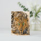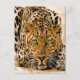 Olhos verdes brilhantes. Em um gato selvagem com manchas pretas e brancas e laranja. Ele está deitado nas quatro patas. Olhando para você. Com os olhos abertos. Neste cartão postal legal