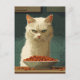 A imagem retrata um gato branco com uma expressão séria, quase desagradada, encarando intensamente uma tigela de cheio de comida de gato diante dela. O fundo apresenta azulejos verdes escuros, aumentando o humor focado e ligeiramente dramático. O pelo do gato é detalhado, e seus olhos verdes estão estreitos, dando a ele uma forte e forte presença. O estilo geral lembra a arte vetorial, com linhas limpas e cores ousadas.
