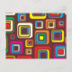 Funky e groovy retro o padrão de azulejos de quadrados de cantos arredondados dos anos 70 nas anos setenta divertidas cores de rosa vívido, amarelo, laranja, verde, azul e vermelho. Colocado sobre um fundo castanho retrorreflector.