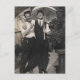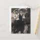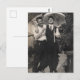 Este cartão mostra dois homens bonitos e bem vestidos da década de 1940 em pé sob guarda-chuvas e rindo.