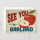 Um charmoso cartão-postal antigo de Garland, Texas, com uma linda maçã vermelha, juntamente com um texto divertido em estilo retrô que diz "Vejo-me em Garland"