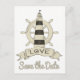 Grite para o mundo que você e sua namorada estão casandos com este anúncio de noivado de casamento náutico divertido. Este anúncio de noivado inspirado por um marinheiro bonito apresenta um farol desenhado à mão e uma roda de navio realçados contra fundo branco nítido. Sua informação de casamento está impressa no verso do cartão postal. Salve a data em que os cartões postais são perfeitos para * convidados fora da cidade * casamentos de destino * casamentos perto dos feriados principais