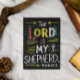Uma representação serena de um pastor que conduz um bando de ovelhas através de uma pasto verde e exuberante. O pastor é acompanhado de uma luz suave brilhando de cima, simbolizando orientação e proteção. LORD É MEU Pastor