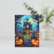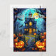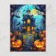 Este cartão-postal fantástico apresenta uma casa assombrada no Halloween na temporada de outono.