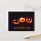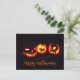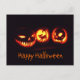 Um cartão postal com 3 talheres de Halloween gravadas. Um com um rosto assustador com dentes afiados, um gato assustador curvo e um crânio ralado sobre fundo escuro.