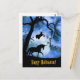 Feliz cartão postal do Halloween com uma bruxa voadora lua grande de cheio, pássaros de carvalho e Unicórnio. Um cartão postal mágico místico do Dia das Bruxas.