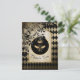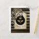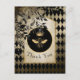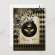 Belo cartão de estilo vintage com fundo harlequin, folhagem, rainha coroada central e texto personalizável em tons de ouro preto e antigo / metais