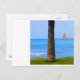 Imagem de uma Waikiki, cena da costa do Havaí de um pássaro (na maioria dos fotos) caminhando para a esquerda, um tronco de palmeira ereta na vertical em praias. Um veleiro com velas listradas vermelhas e amarelas navegando no oceano Pacífico azul ondas ao largo de Waikiki, Havaí. Algumas nuvens brancas no fundo tropical. Foto digital.
