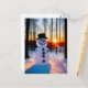 Este postal mostra um bonitão de neve na floresta no pôr do sol.