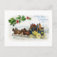 Uma barata sendo puxada por quatro cavalos através da neve e do carregando de muitos passageiros, um deles tocando uma buzina em um cartão postal de natais vintages de 1914.