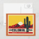 Uma design de viagens vintage baseada em uma etiqueta de bagagem do Hotel Colonial em Salta, Argentina. Motif do deserto mostra um cacto saguaro e um pôr do sol sobre as montanhas dos Andes.