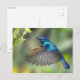 Cartão de animal mostrando um lindo beija-flor azul pairando néctar das flores. Os beija-flores são aves do Novo Mundo que constituem a família Trochilidae. Elas estão entre as menores aves. Eles são conhecidos como beija-flores por causa do som de beija-flores criado por suas asas batendo que batem em altas frequências audíveis para os humanos. Eles pairam no ar do médio a velocidades de flapping de asas rápidas, geralmente cerca de 50 vezes por segundo, mas possivelmente até 200 vezes por segundo. Os beija-flores têm o maior metabolismo de qualquer animal homeotérmico. Para conservar energia quando a comida é escassa, eles têm a habilidade de entrar em estado de hibernação.