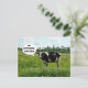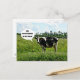 Vaca negra e branca parada no pasto, com um pequeno e humorístico ditado: "Estou em destaque no meu campo!"