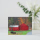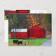 Cavalos pastam em frente ao celeiro vermelho vivo. As cores de queda estão no fundo.