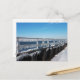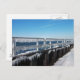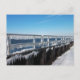A foto cênica mostra branco congelado, vento soprado, gelo congelado. Estão a balançar-se de uma grade de metal e antepara. A neve pode ser vista em frente à antepara. A água azul da baía junto com um céu azul, pode ser vista ao fundo. Esta foto paisagística foi tirada no extremo norte de Long Beach Island em Barnegat Light, Nova Jersey.