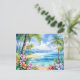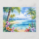 Envie um pedaço de paraíso com este cartão postal de praia tropical! Com palmeiras vibrantes, flores tropicais coloridas e uma vista serena do oceano, este trabalho de arte ao estilo aquarela captura a perfeita fuga da ilha. Ideal para guardas de férias, presentes de viagem ou adição de um toque ensolarado à sua correspondência.