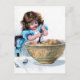 Bonito ilustração da safra, com uma jovem criança misturando bolo ou mistura de pão numa grande taça antiga com uma colher de madeira. Bonito vestido azul e branco. Uma bela ideia de presente para um cozinheiro, cozinheiro, padeiro, criança que gosta de cozinhar etc.