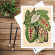 Um cartão postal de arte botânica com uma ilustração de caládios multicoloridos em vermelho, verde e branco.