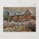 Um desenho artístico de um belo e antigo edifício Tudor com a casa vazia na frente e estábulos num pátio nas traseiras, numa noite muito fria, coberta de geada e neve.