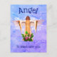 Adorável anjo da guarda com violetas roxas bonito aos seus pés num cartão postal inspirador de fundo azul pálido. Esta imagem está disponível em muitos produtos da minha loja. Visite o tesouro dos olhos sorrindo para ver mais fotografias de flores e natureza e cartões e presentes de arte digitais.