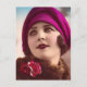 Fotografia colorida de uma bela jovem no colarinho de pele e chapéu de fuschia. Batom vermelho escuro e flor vermelha no colarinho.