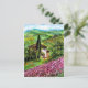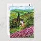Paisagem da Toscana, colorida, vibrante e expressiva beleza dos campos italianos e da íris violeta púrpura, bela flora de Verão em verde claro, amarelo, castanho, azul, branco, prados, campo de flores, ciprestes e oliveiras, antiga casa de fazenda rústica sob o céu azul e nuvens brancas. Pintura acrílica em canvas.